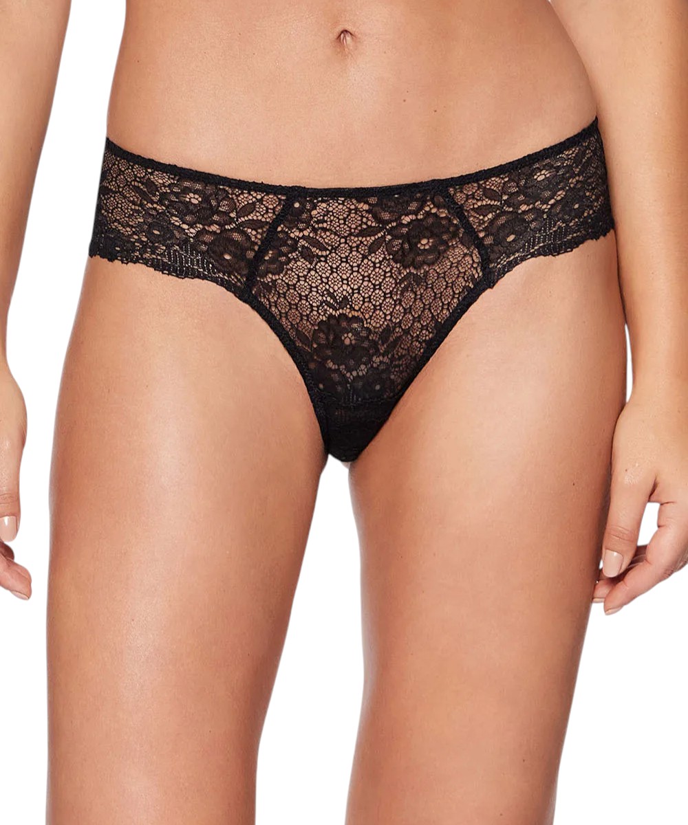 Calcinha biquíni confeccionada toda em renda, sem forro, com recortes que modelam o corpo e acabamento em elástico confortável rebatido no cós.