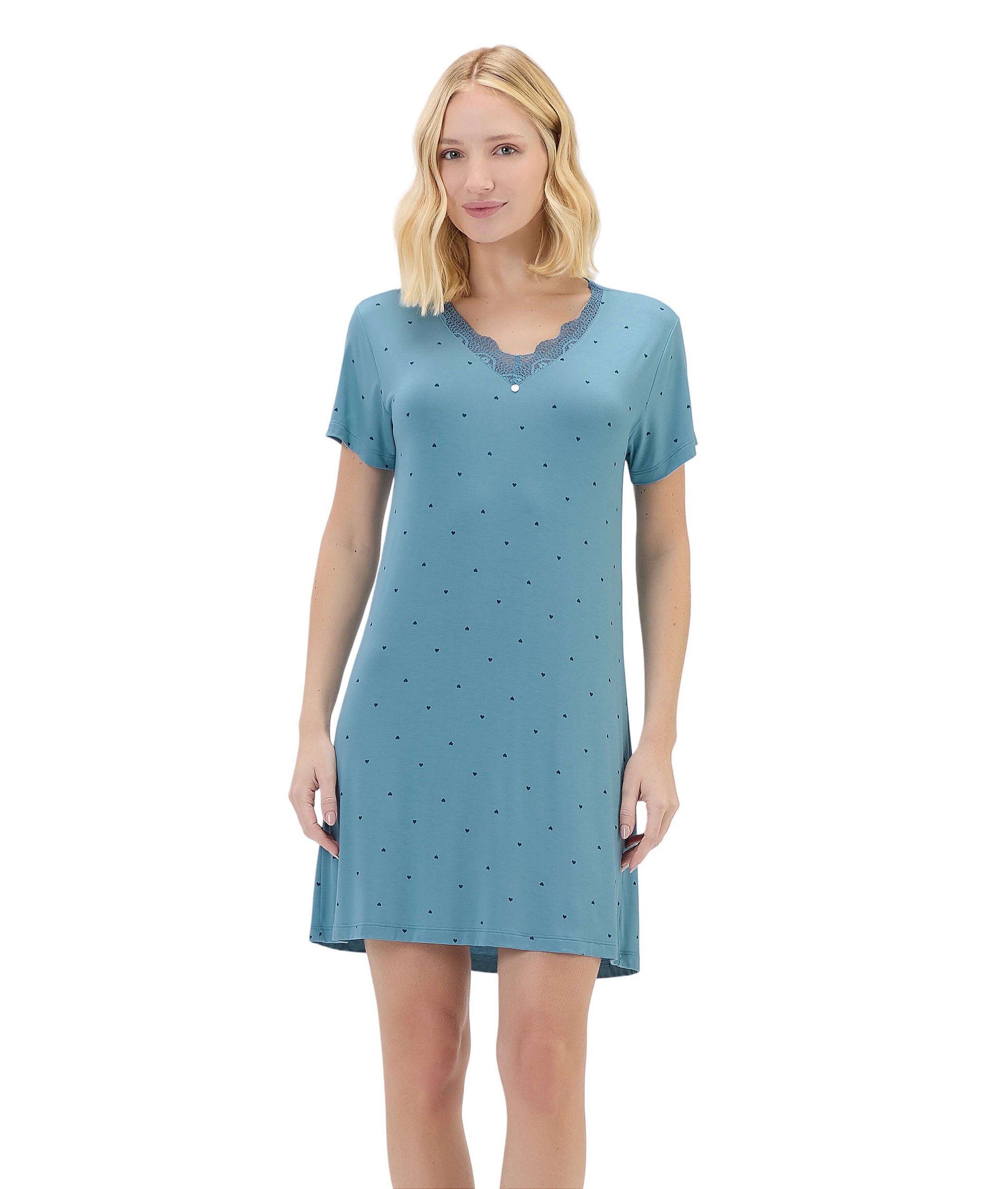 Delicada, fresquinha e cheia de charme. Confeccionada em malha visco comfy, essa camisola oferece toque macio, caimento leve e muito conforto para as suas noites. Com fundo azul e estampa rotativa de mini corações em tom sur tom, traz um visual romântico e discreto. O destaque fica por conta do decote ?V? com detalhe em renda na mesma cor da malha, que adiciona feminilidade na medida certa. Ideal para quem busca suavidade e estilo ao dormir ou relaxar em casa. Modelo veste tamanho P.