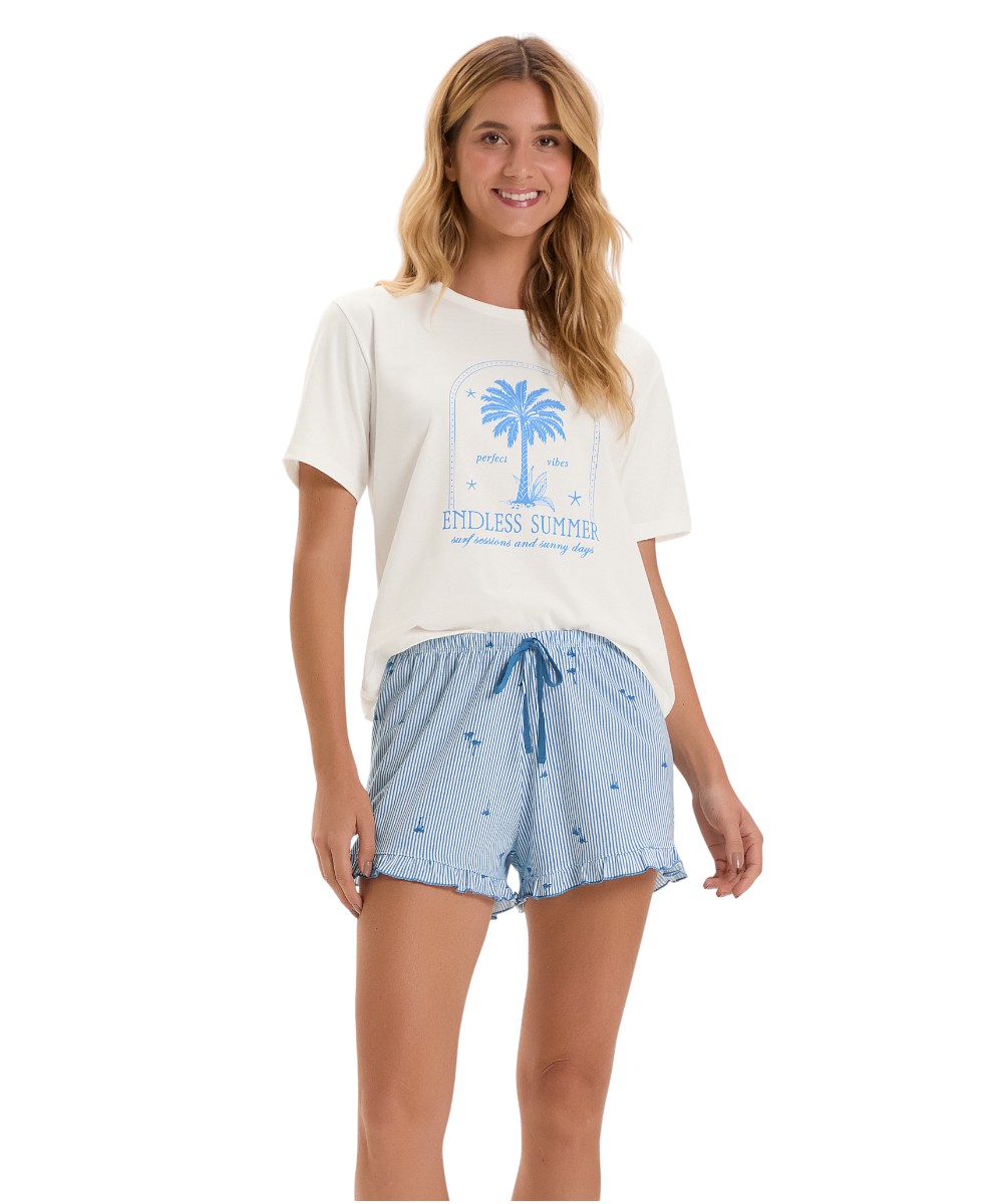 O shorts com estampa rotativa de listras finas em azul e off white, recebe uma charmosa interferência de mini coqueiros em tom sur tom, trazendo unidade visual ao conjunto. O cós elástico conta com detalhe em falso amarrador na cor azul médio, e a barra com babado delicado adiciona feminilidade e leveza ao look.