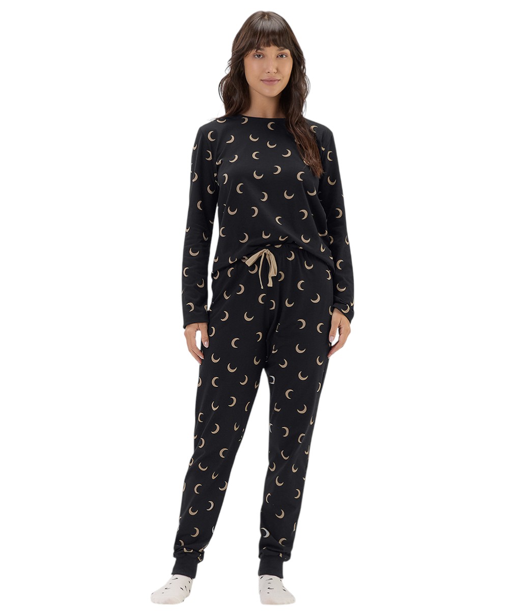 Pijama composto por blusa de manga longa e calça jogger, confeccionado em malha comfort de toque suave e agradável, que oferece conforto e respirabilidade durante o uso. A peça apresenta estampa rotativa de meias-luas desenvolvida na técnica de corrosão, garantindo um visual moderno e efeito delicadamente desgastado. A calça possui cós com elástico interno e cadarço decorativo, com base de modelagem jogger, que adiciona um charme extra ao conjunto. Ideal para noites de descanso ou momentos de relaxamento, o modelo combina estilo, leveza e praticidade em uma proposta contemporânea e confortável. Modelo veste tamanho P.