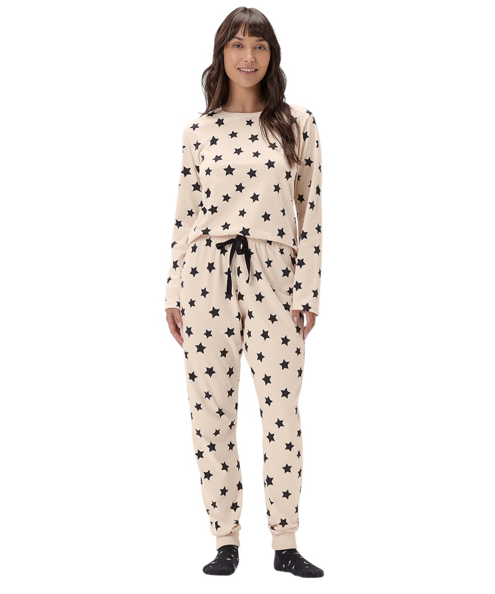Conforto, estilo e delicadeza em um só conjunto! Este pijama feminino longo é confeccionado em malha comfort macia e respirável, garantindo toque suave e liberdade de movimento, ideal para noites de descanso ou momentos de relaxamento em casa. A blusa de manga longa traz estampa rotativa de estrelas, conferindo um visual delicado e divertido. A calça jogger combinando mantém o conforto total, com cós com laço decorativo de poliamida, adicionando um toque feminino e sofisticado ao conjunto. Modelo veste tamanho P.