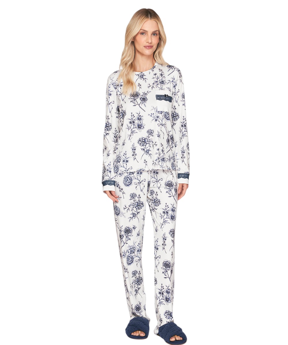 Feito para quem busca o máximo conforto sem abrir mão do estilo. O pijama comfort envolve o corpo com suavidade e aconchego. Ele traz o charme e a elegância da estampa de flores em sublime touch com toque aveludado proporcionando maciez e caimento impecável. Possui detalhes de bolso e punhos com renda delicada. Ideal para suas noites de descanso e aconchego.