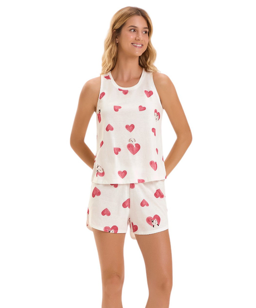 Delicado e cheio de personalidade, este pijama feminino foi criado para quem ama conforto e também não resiste a uma dose de fofura! Confeccionado em malha comfort, com toque suave e caimento leve, o conjunto é ideal para noites aconchegantes e cheias de charme. A regata, com modelagem confortável e alças largas, traz um fundo off white encantador, estampado com corações em tons suaves e a presença especial dos novos mascotes da marca: uma gatinha frajola curiosa e um cachorrinho branco com cinza, de olhar doce e companheiro. A estampa é distribuída de forma rotativa, criando uma composição divertida e afetiva. O shorts acompanha a mesma estampa rotativa, com cós de elástico embutido que proporciona ajuste perfeito sem apertar. Um conjunto ideal para quem busca leveza, estilo e aquele toque lúdico que aquece o coração. Perfeito para noites tranquilas e momentos de relaxar com carinho. Composição Conjunto: 100% Algodão