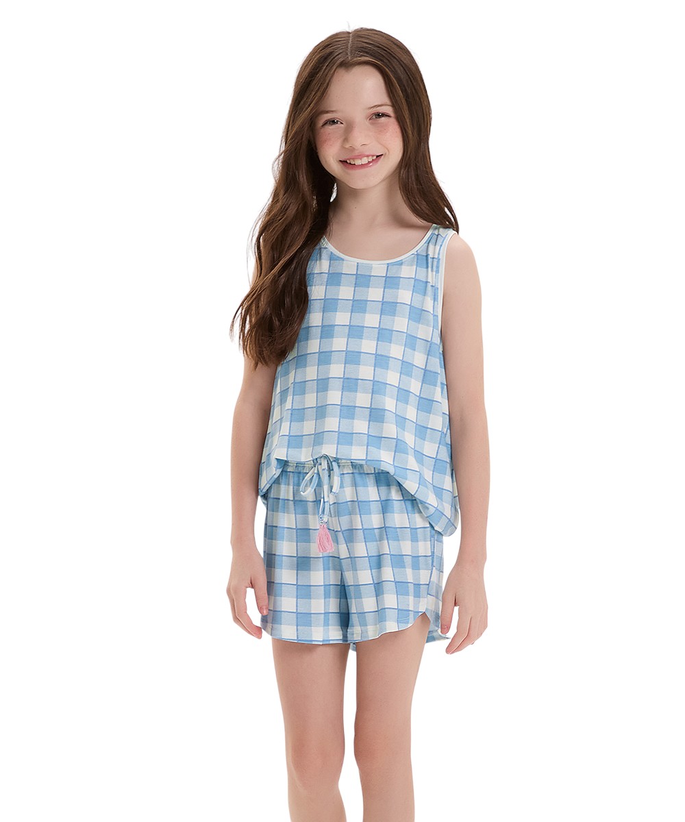A regata tem modelagem confortável, com estampa de xadrez tartan em tons de azul sobre fundo off white, deixando o visual moderno e delicado ao mesmo tempo. O shorts acompanha a mesma estampa, com cós elástico confortável e detalhe de falso amarrador com friso da própria malha, finalizado com tasséis cor-de-rosa, que trazem um toque divertido e cheio de charme para a peça.