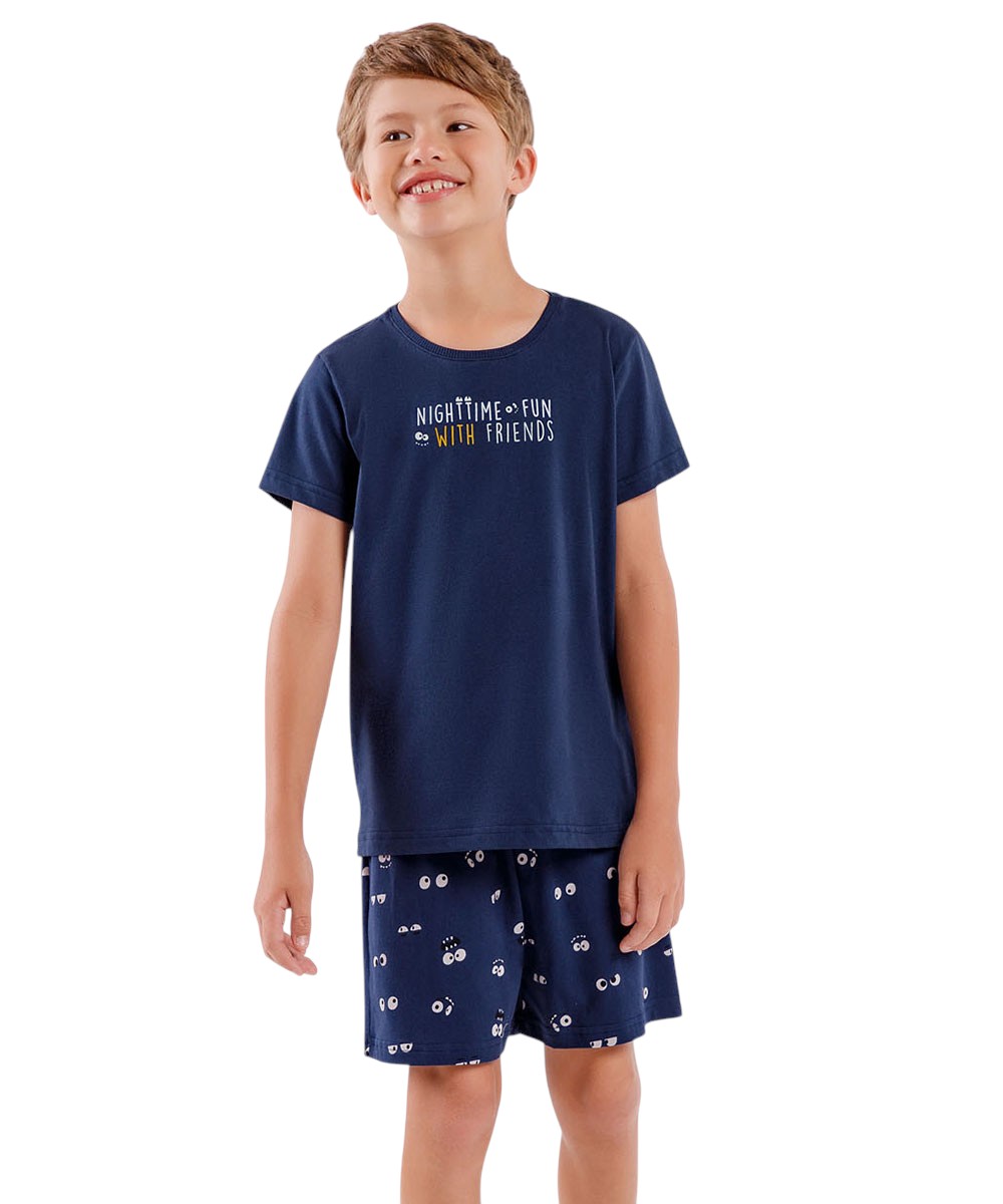 Pijama manga curta com Bermuda. Estampa exclusiva de olhinhos no bermuda e um toque especial na blusa, com uma estampa localizada que brilha no escuro. Perfeito para deixar a hora de dormir ainda mais lúdica e confortável.