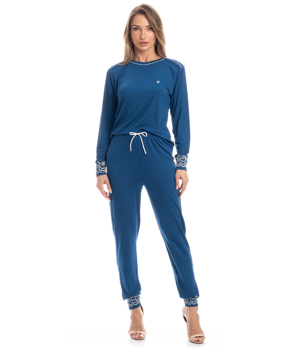 Pijama Feminino Longo Brisa é puro conforto para todas as horas! Em modelagem ampla e extremamente confortável, a peça conta com acabamentos em vivo contrastante no decote e ombros. Sua manga longa possui punhos com uma sofisticada renda aplicada. Detalhe para o bordado logo Daniela Tombini em sua lateral esquerda. Já a sua calça, em modelagem Jogging possui laço no cós e punhos com renda aplicada. Muito conforto para suas horas de descanso! Confeccionado em Viscolycra, tecido proveniente da fusão da fibra de elastano com o fio de viscose, gerando um tecido leve e confortável de fácil cuidado. É uma das principais bases usadas em nossa marca por sua maciez e conforto. Com recortes em Renda, um tecido transparente de malha aberta, fina e delicada, que forma desenhos variados com entrelaçamentos de fios de poliamida, poliéster ou algodão. Apresenta elastano em sua composição, o que deixa a peça muito mais confortável, macia e elástica.