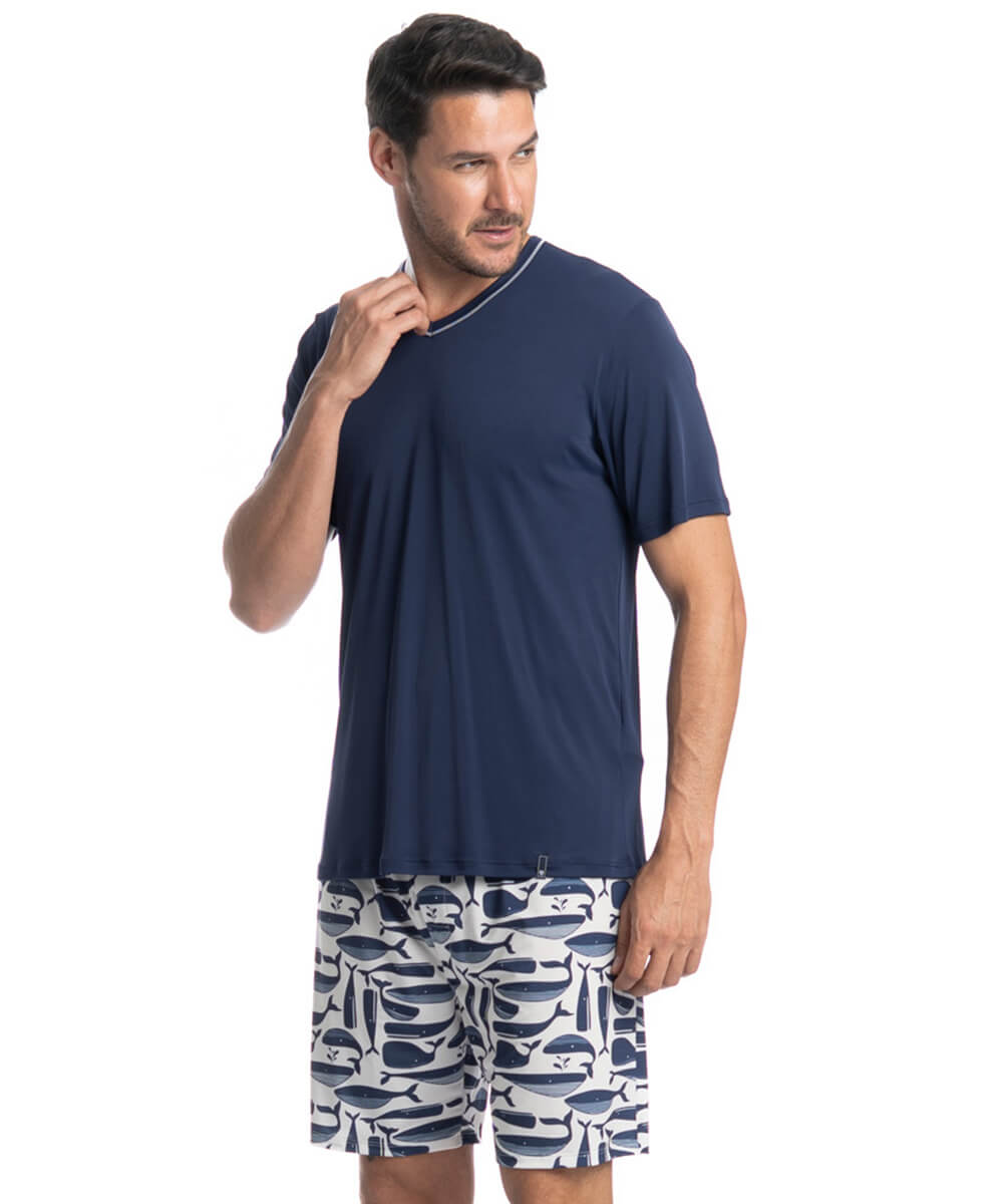 Pijama Masculino Curto Estampado Clóvis Tombini é o clássico com estilo que você gosta! Sua blusa manga curta, é lisa com decote em V e possui detalhe em trançador contrastante. Conta com diferentes cores para te deixar ainda mais confortável e estiloso nos melhores momentos! Confeccionada em Liganete Microfibra Amni, tecido de poliamida característico pelo seu toque de malha fria, caimento leve e de fácil cuidado. A composição do tecido conta com a excelência do fio Rhodia Amni de alta qualidade. Já o seu short, é todo estampado pelo processo de sublimação, deixando o desenho com um aspecto perfeito e toque zero no tecido. Confeccionado em Light Print, tecido com tecnologia dry tem secagem rápida e conforto térmico. Fabricado com fio microfibra texturizado, proporciona maior conforto, maciez e respirabilidade. Composição: Liganete Microfibra Amni: 100% Poliamida Light Print: 90% Poliéster - 10% Elastano