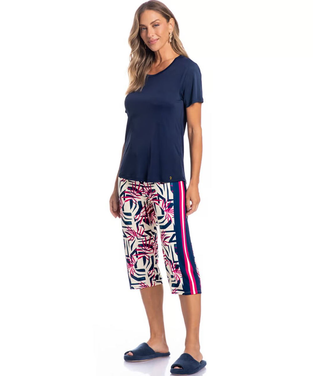 Pijama Feminino Pescador Inês é pura elegância! Em modelagem ampla e confortável, sua blusa é lisa, manga curta possui decote redondo com acabamento em viés. Detalhe para a plaquinha logo Daniela Tombini na lateral inferior esquerda da peça. Já a sua calça em modelagem pescador é toda estampada, com elástico macio no cós para melhor descanso. Sua blusa, Confeccionada em Liganete Microfibra Amni, tecido de poliamida característico pelo seu toque de malha fria, caimento leve e de fácil cuidado. A composição do tecido conta com a excelência do fio Rhodia Amni de alta qualidade. Seu shorts, confeccionado em Light Print Estampado, tecido com tecnologia dry tem secagem rápida e conforto térmico. Fabricado com fio microfibra texturizado, proporciona maior conforto, maciez e respirabilidade. Característico pelo seu toque de malha fria, caimento leve e de fácil cuidado. Sua composição permite estampas com mais definição, cor e brilho acetinado.