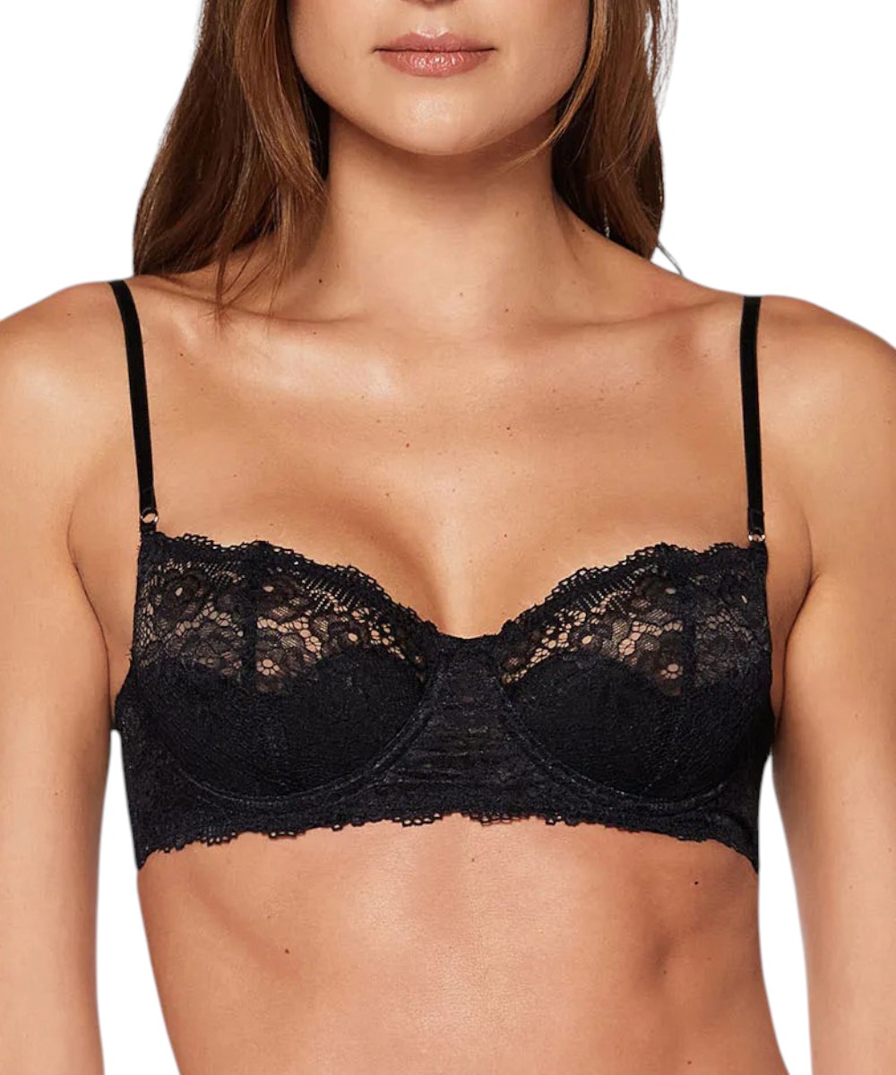 Sutiã leve com aro e manta recortada em formato de coração. Alças reguláveis com detalhe de argolinhas na frente e costas, e fecho nas costas.